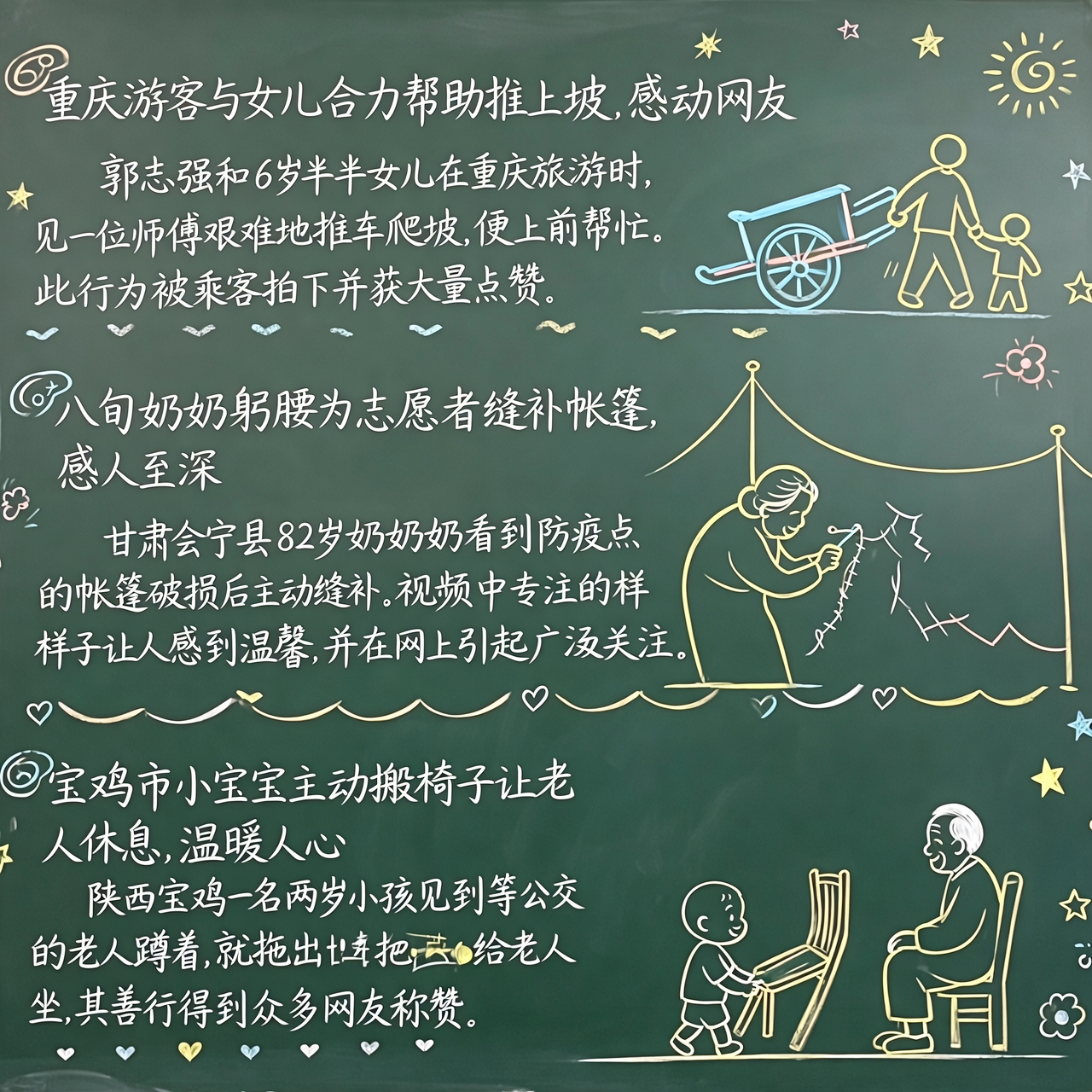 在陕西省宝鸡市,一个两岁的小宝宝看到一位老人蹲在马路边等公交车,便主动拖着一把椅子让老人坐下休息。宝宝的外婆表示,自己家门口正对着公交站牌,每天有不少老人在这里等公交,有时候她会给老人们搬板凳坐,没想到宝宝也跟着学了。这段视频发布后,许多网友为之感动,并称赞宝宝的行为。(来源:[人民网](http://gs.people.com.cn/n2/2022/0722/c358184-40048868.html))
