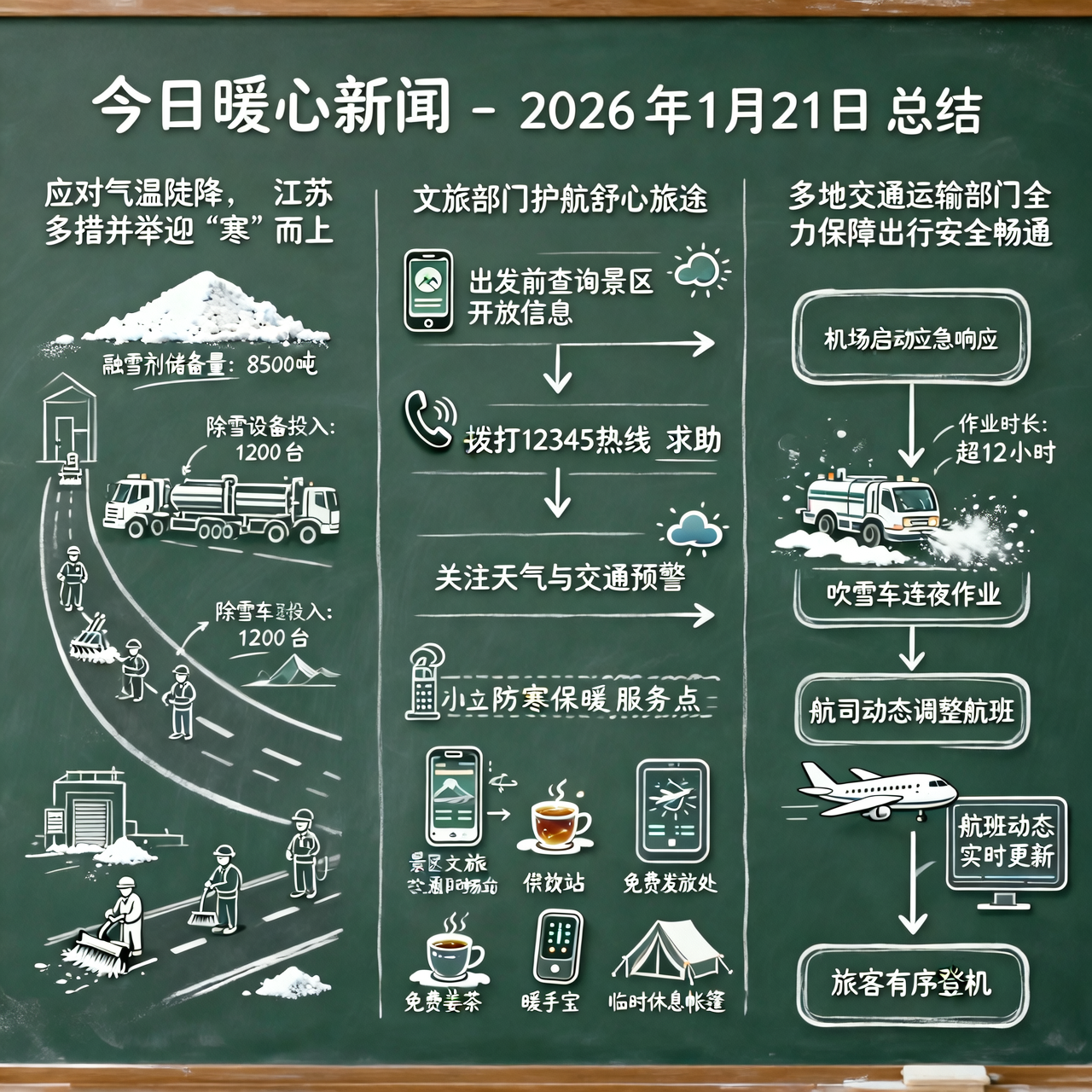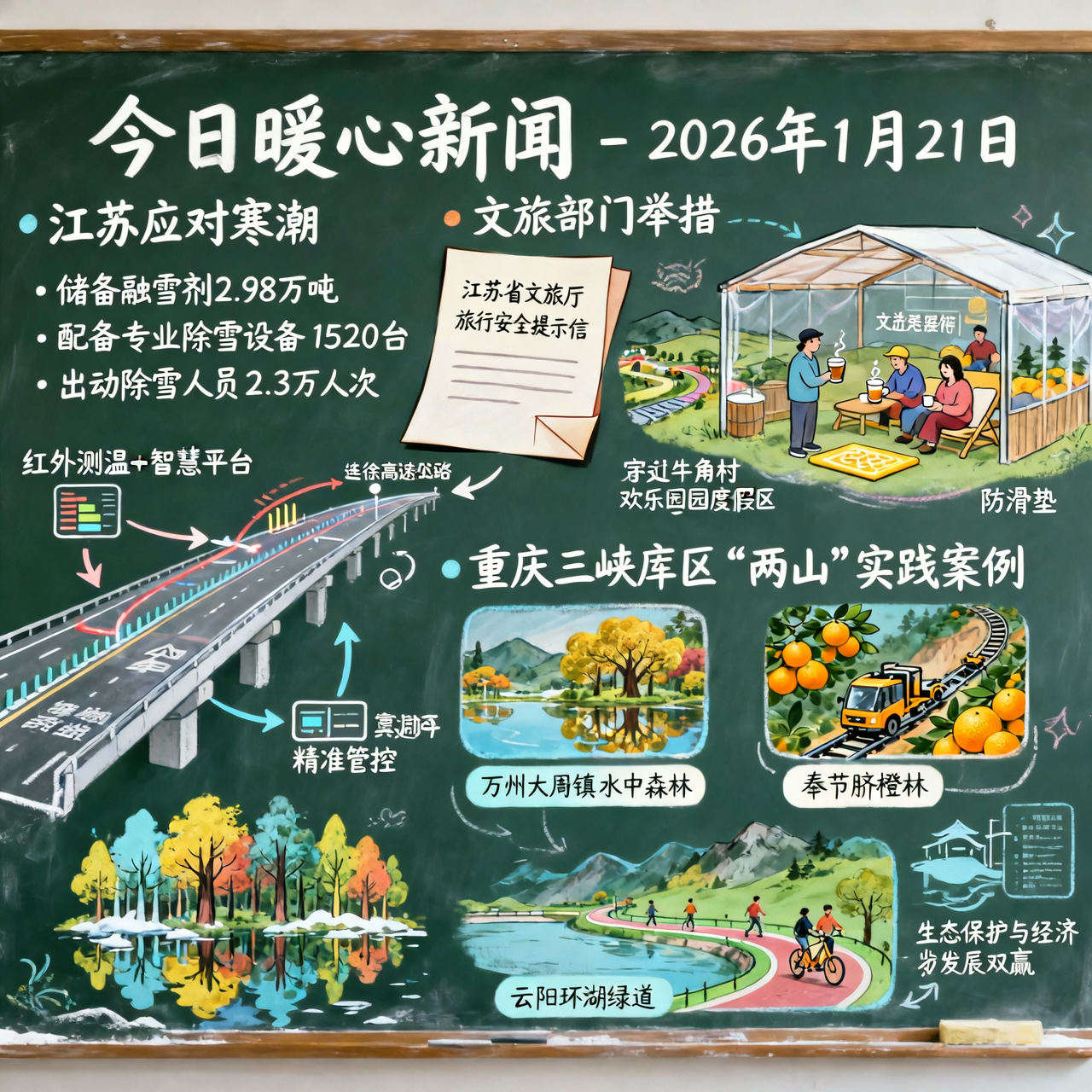 应对气温陡降,江苏多措并举迎“寒”而上 在面对突如其来的寒潮天气时,江苏省采取了多项措施来保障居民的日常生活需… 继续阅读今日暖心新闻 – 2026年1月21日